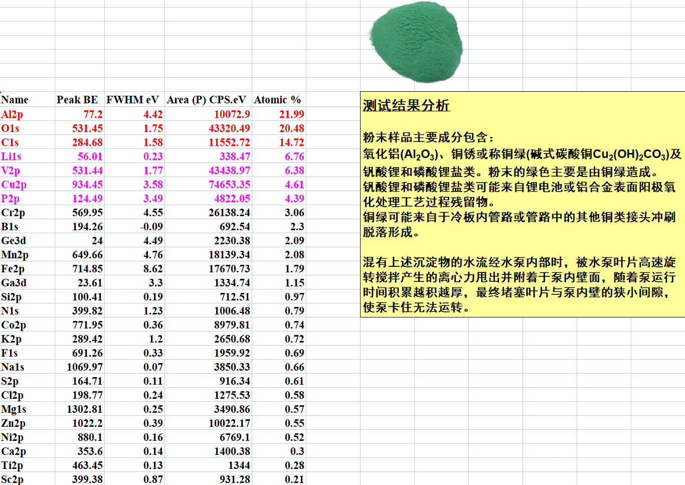 前段時間,酷凌時代某冷水機客戶現場工作人員反饋,其使用的激光冷水機運行一段時間后出現水泵堵轉,導致流量報警拆開后發現有綠色雜質。客戶百思不得其解,綠色雜質究竟怎么產生的?酷凌時代售后工程師經跟客戶溝通,該客戶現場為普通車間,冷水機使用的也是可飲用的純凈水,為幫客戶及時并系統的解決問題,特別找到了酷凌時代公司合作單位,中國科學院大連化學物理研究所的韓教授,將從客戶端拿來的粉末雜質樣品快遞給了韓教授。韓教授收到樣品后,第一時間安排實驗檢測。