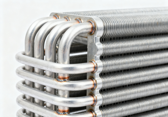 翅片式蒸發器多用于風冷型冷水機中,通常結合風扇強制空氣流動,通過翅片擴大換熱面積。
