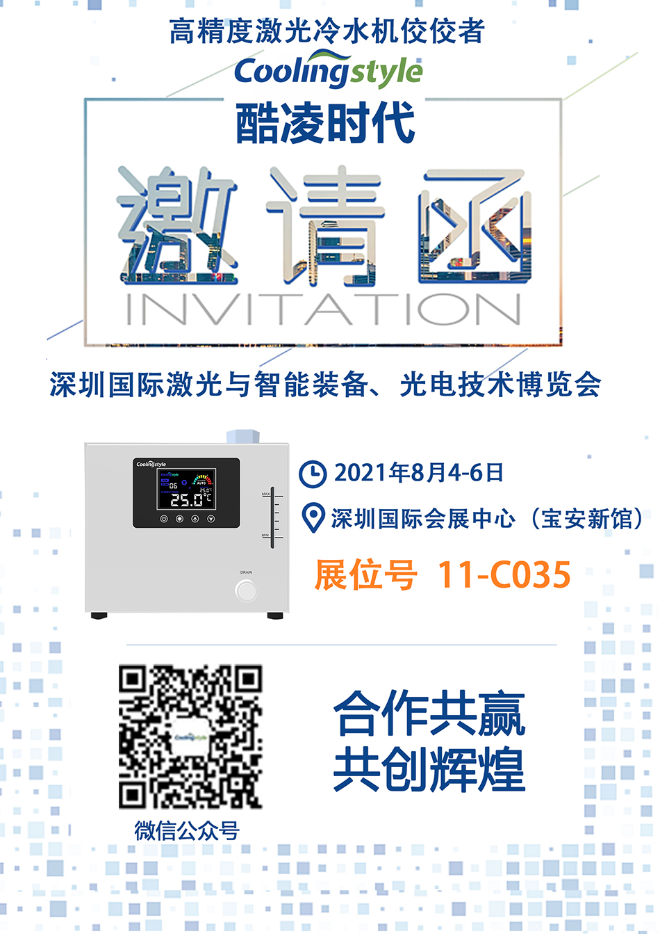 本次展會酷凌時代將攜帶Q420升級系列全新制冷產(chǎn)品高精度微型冷水機Q420/Q580系列及熱銷激光冷水機4U,5U,6U系列及其它相關熱銷制冷設備產(chǎn)品參展。酷凌時代(展位號:11-C035),8月4-6日,我們在深圳國際會展中心(寶安新館)等您哦!讓我們一起共赴這場高規(guī)格、高質(zhì)量的激光行業(yè)盛會。