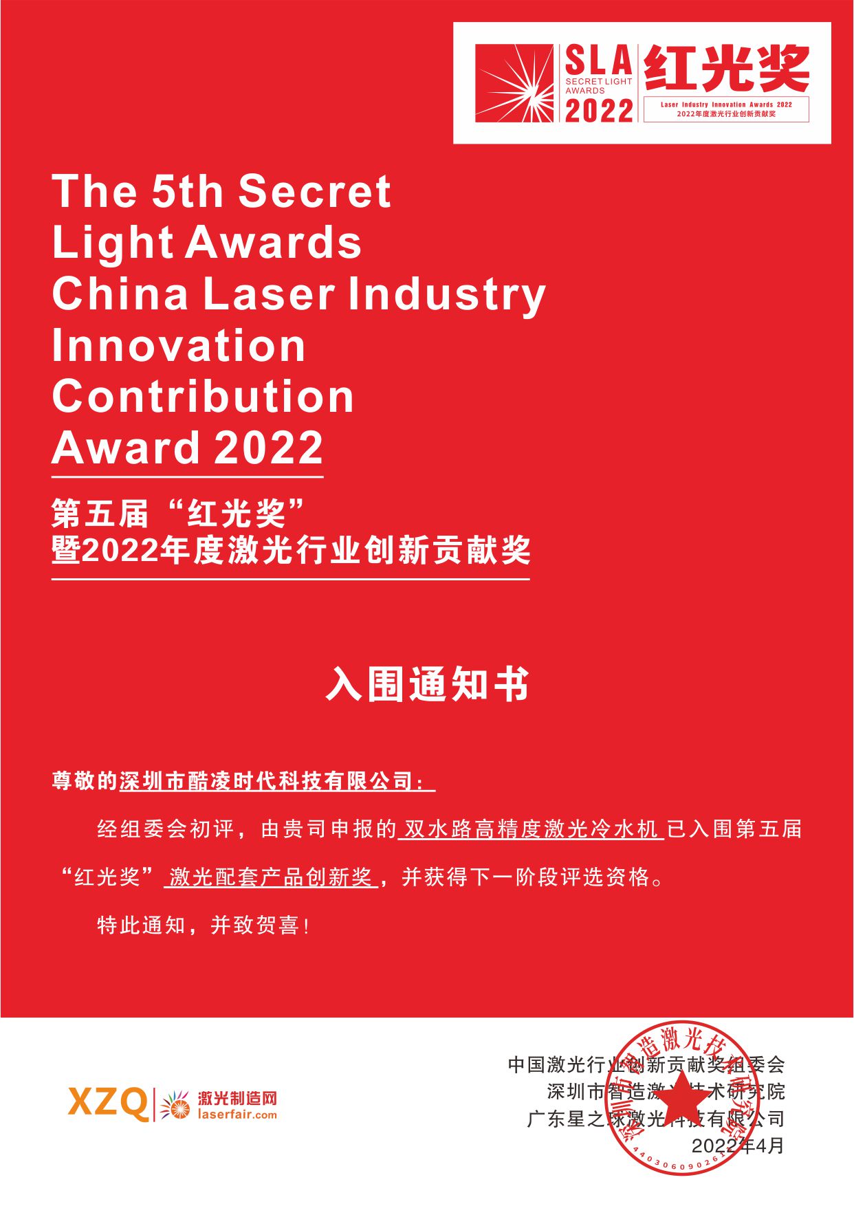 感謝讓創(chuàng)新被看見,讓貢獻被銘記!由中國激光行業(yè)創(chuàng)新貢獻獎組委會與國內(nèi)具有領(lǐng)先影響力的行業(yè)媒體“激光制造網(wǎng)”主辦的第五屆“紅光獎”初審已結(jié)束,經(jīng)過初選,共有133家企業(yè)189項產(chǎn)品競逐本年度激光行業(yè)大獎。非常高興, 酷凌時代申報項目再次成功入圍,目前網(wǎng)絡(luò)投票活動已正式開啟。