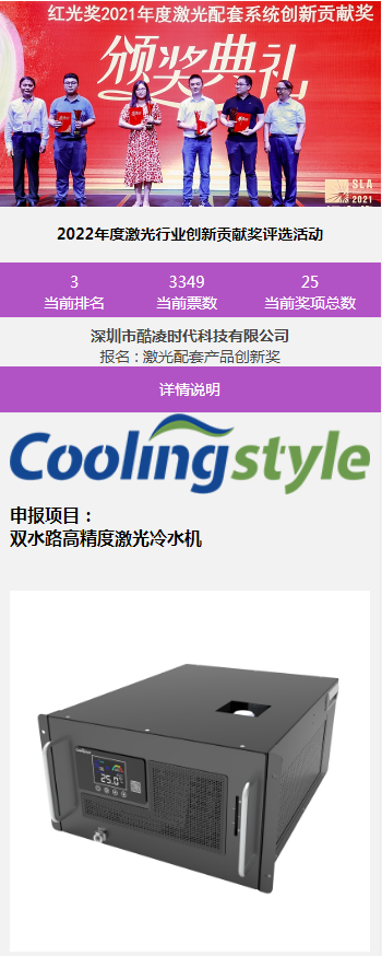 酷凌時代有幸再次入圍“紅光獎”參選,申報獎項:激光配套產品創新獎,申報產品:雙水路高精度激光冷水機,目前投票依舊在如火如荼的進行中,每天都在瘋狂投票和拉票中!目前酷凌時代所申報的獎項投票排名,位居第三??崃钑r代在此感謝每個支持和信任的客戶、親朋及好友們,感謝大家投出的每一票。