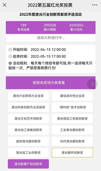 為期一個月的2022“紅光獎”首輪投票比拼已經進入倒計時階段,自4月15日投票通道開啟以來,共133家入圍企業開啟了“瘋狂”宣傳、“花式”拉票模式,微信群、朋友圈出現刷屏、霸屏現象。個人、企業、社會各界紛紛為參評企業搖旗吶喊,讓激光科技惠及各行各業。