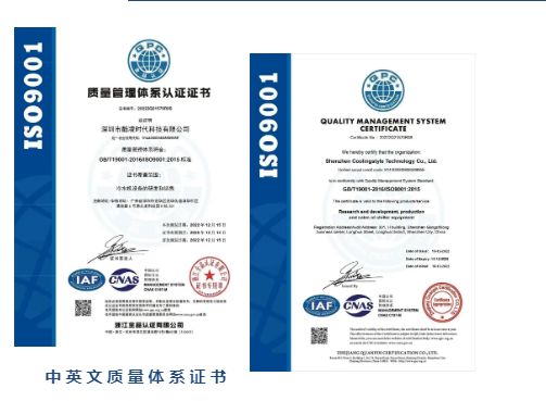 經(jīng)過質(zhì)量體系認證專家全面、嚴格、細致的審核后,繼12月6日,酷凌時代浙江公司收到中英文ISO兩項管理體系后,12月15日,酷凌時代深圳公司再次取得ISO質(zhì)量管理體系和環(huán)境管理體系認證中英文雙證書?,F(xiàn)將酷凌時代深圳公司相關(guān)證書內(nèi)容公告如下: