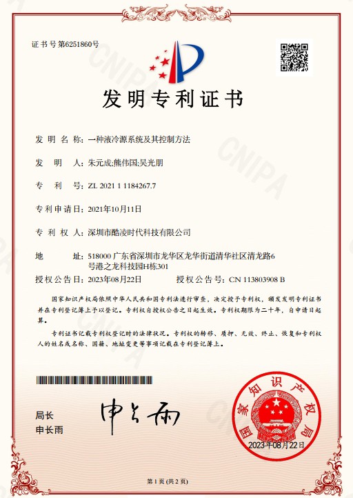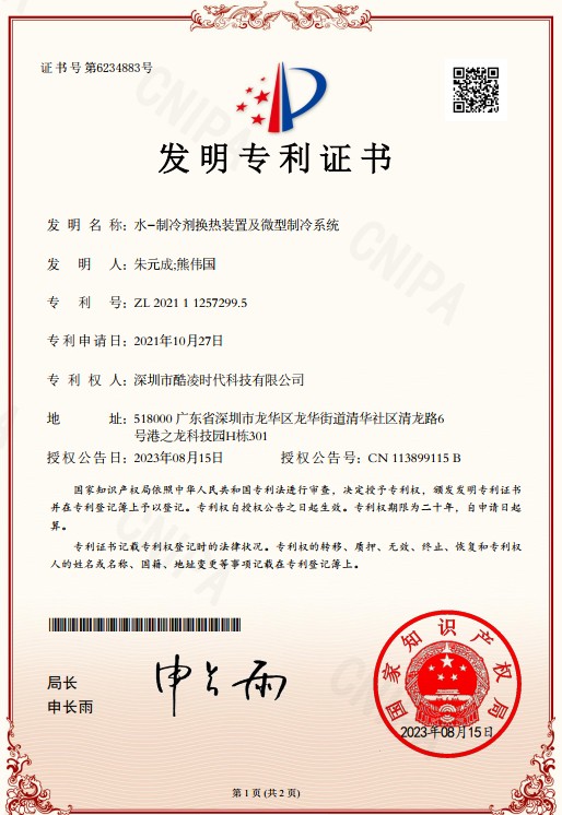 近期,酷凌時代公司再次獲得國家知識產權局發明專利授權,并近日正式收到國家知識產權局頒發的兩項《發明專利證書》。專利名稱分別為-制冷劑換熱裝置及微型制冷系統一種液冷源系統及其控制方法。這是酷凌時代產學研融合的又重要成果