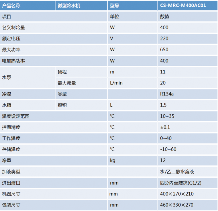 CS-MRC-M400系列是一款迷你型、多用途的微型冷水機,以小巧便攜輕重量進行設計,體積僅有400*270*210,可廣泛適用于激光降溫、LED降溫、服務器降溫、電子設備降溫等諸多領域。