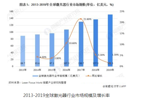 據數據顯示,2013-2019年全球激光器市場規模持續增長,2019全球激光器市場規模為151.3億美元,同比增長1.3%。隨著市場增速放緩,產業發展逐漸顯露困境:產品同質化日趨嚴重,市場價格競爭無序,產品毛利率大幅下降,中小企業生存環境愈發艱難……