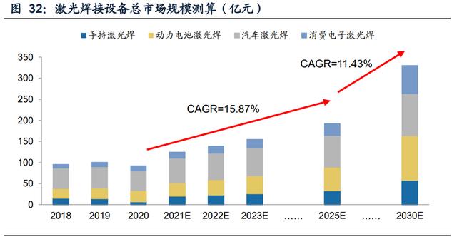 通過對低端制造以及高端制造各細分領域的市場規模測算,認為到2025年,激光焊 接設備市場規模可以達到192.01億元,2030年達到329.86億元。2020至2025年, 市場規模復合增速為15.87%;2025-2030年,增速為11.43%。對照Ofweek提供的 2020年以前市場規模數據,我們的測算與其差額均在10億元以內,測算結果較為可 靠穩健,具有一定現實依據。