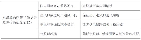 4,出現E5水溫超高報警,有可能是熱負荷超標,建議降低熱負荷,或使用更大制冷量的機型。