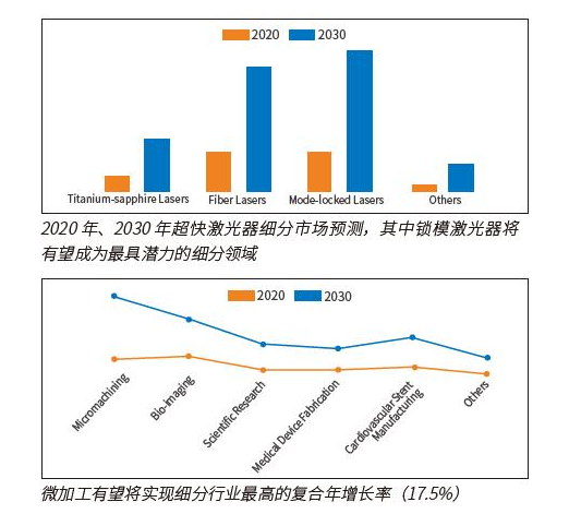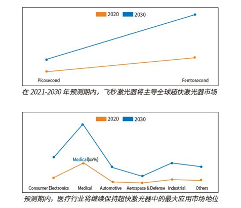 就2020年整體情況來看,光纖激光器主導了超快激光器市場,預計在預測期(2021-2030)內將仍占據領先的趨勢。根據脈沖持續(xù)時間,超快激光器分為皮秒和飛秒,目前飛秒激光器細分市場主導著市場。