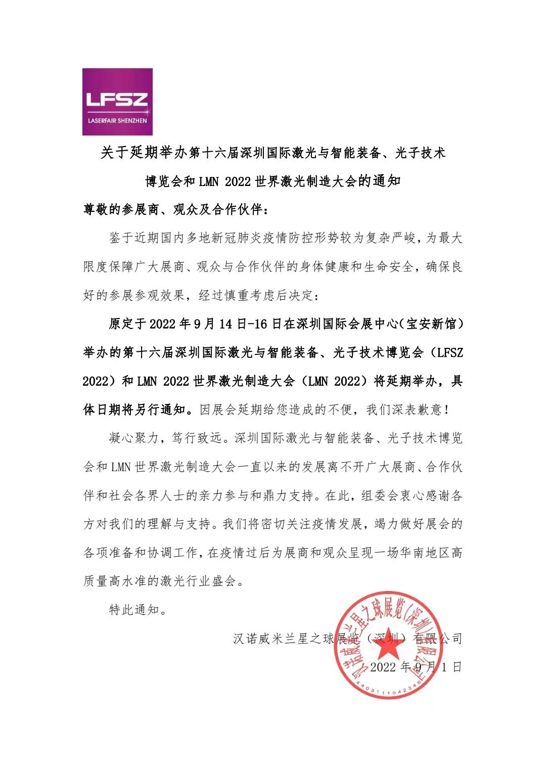 因近期多地新冠肺炎疫情防控形勢較為復雜嚴峻,為最大限度保障廣大展商、觀眾與合作伙伴的身體健康和生命安全,確保良好的參展參觀效果,本次展會的主辦方經(jīng)過慎重考慮后決定:原定于2022年9月14日-16日在深圳國際會展中心(寶安新館)舉辦的第十六屆深圳國際激光與智能裝備、光子技術(shù)博覽會(LFSZ 2022)和LMN 2022世界激光制造大會(LMN 2022)將延期舉辦,具體日期將另行通知。