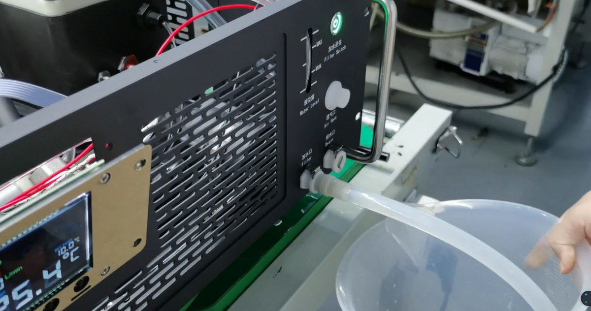 2.在加水口接入配套接頭和水管,并將水管深入備好的水(防凍液)中,打開(kāi)透氣口蓋帽。按下加水開(kāi)關(guān),內(nèi)置水泵自動(dòng)將水吸入機(jī)器內(nèi),此時(shí)可以視液窗看到液位緩慢上升。松開(kāi)加水開(kāi)關(guān)可停止加液,必須加液至最低液位線(xiàn)以上,為了使冷水機(jī)達(dá)到更好的效果,推薦加液至最高液位線(xiàn),最大注水量大約1.8L。若加水過(guò)程中發(fā)現(xiàn)透氣口有水溢出,說(shuō)明已完全加滿(mǎn),應(yīng)立即停止加水。加水完成,斷開(kāi)加水管,并蓋上透氣口蓋帽。
