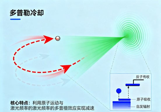 其核心原理源于“多普勒效應”。當一束激光與移動的原子相遇時,如果激光的頻率略低于原子的吸收頻率,那么那些迎著光線運動的原子會“感受到”光頻率略高,從而吸收光子。吸收光子后,原子獲得一個反向動量,使其運動速度減慢。當原子再隨機輻射出一個光子時,由于方向是隨機的,總體上平均動量減小——這意味著溫度下降。